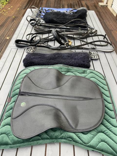 À vendre filet cuir noir, martingale, élastiques, mors à chaînette, amortisseur, protection sangle et selle en mouton, tapis de selle, sangle