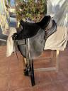 Sella in buone condizioni (qualche segno d'uso), con un top in vera pelle di pecora per un maggiore comfort E il suo top in pelle originale. Arco standard taglia M. Venduta completa di pelli per staffe, staffe a conchiglia per sicurezza e comfort, sottopancia (cinghie per sottopancia basse da 60 cm).